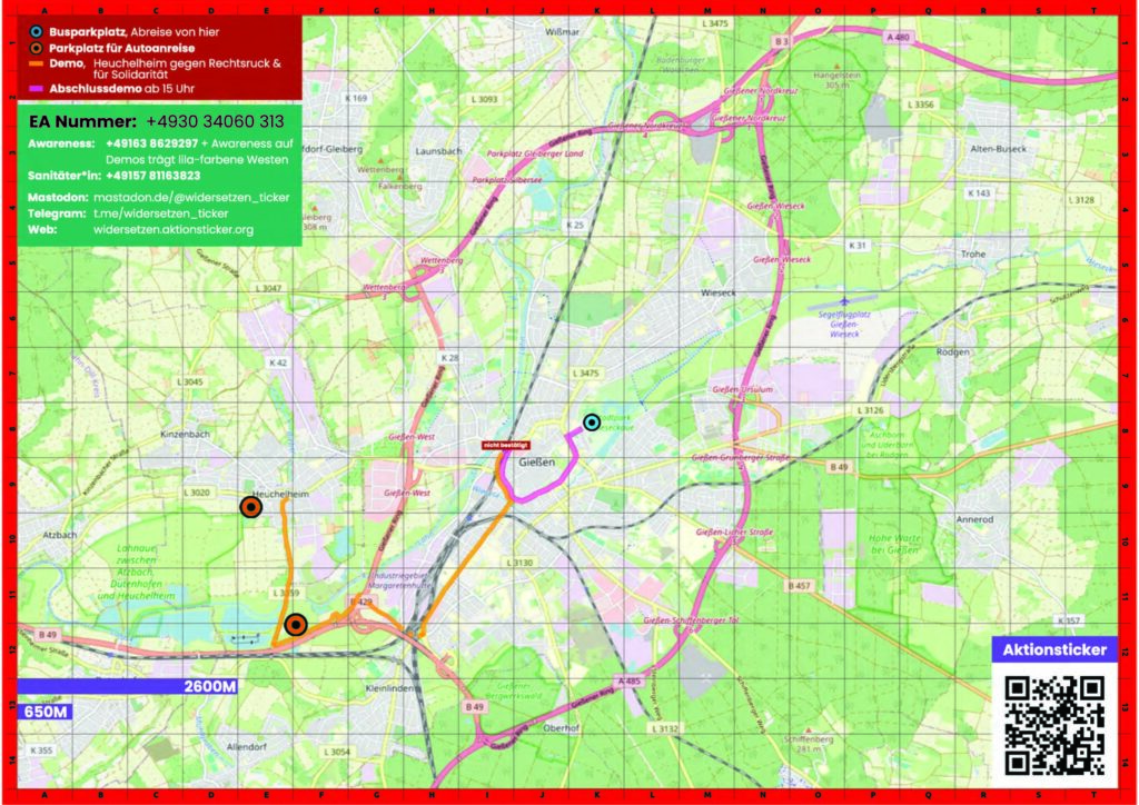 Alle zusammen gegen den Faschismus! Du kannst am 29.11 nicht in Gießen dabei sein? Du gehörst trotzdem dazu! Ob Care-Arbeit, Barrieren, (chronischer) Krankheit, Lohnarbeit, oder aufgrund politischer Repressionen – wir wissen, dass es nicht allen möglich ist, sich an einem Samstag für politische Aktionen in den Bus und auf die Straßen zu begeben. Das betrifft vor allem Menschen mit Behinderung oder chronischen Krankheiten und diejenigen, die auch von Armut und/oder Rassismus und/oder Patriarchat betroffen sind.